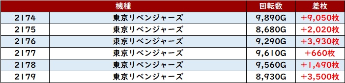 まずは「東京リベンジャーズ 2174~2179」が全台プラス差枚と満足度の高い結果に!