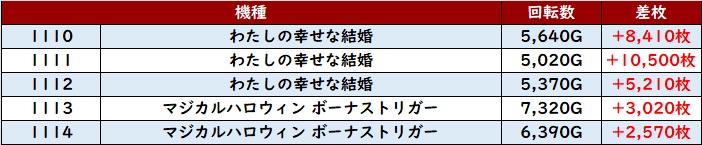 更に「わた婚~マジハロBT 1110~1114」全台差枚数+2,500枚超えの素晴らしい結果を記録!