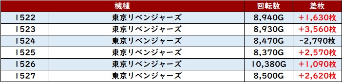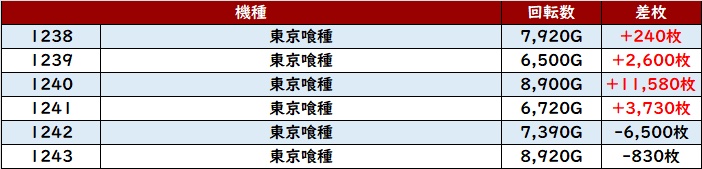 朝イチは「東京喰種」「銭形5」「かぐや様」「新鬼武者3」「マギレコ」「いざ番」「東京リベンジャーズ」「スマスロ北斗」と埋まっていった。