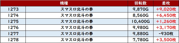 まずは「スマスロ北斗 1138~1143、1273~1278」がどちらも回転数1万G超えが見られる程の高稼働に!