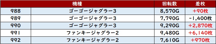 まずは数ある「ジャグラーシリーズ」のピックアップ箇所から「ゴージャグ3~ファンキー2 988~992」に注目!