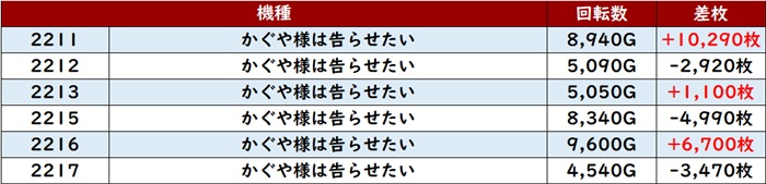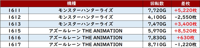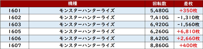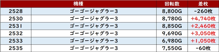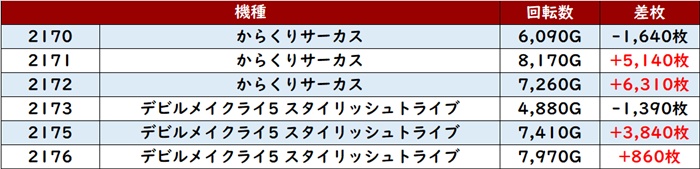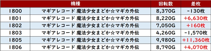 こちらも状況の良さを活かし、6台中5台が大幅プラス差枚と盛況ぶりを発揮していた。