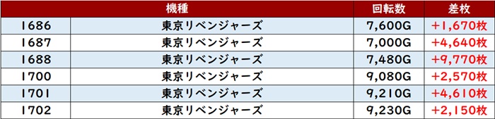 まずは「東京リベンジャーズ 1686~1702」が全台大幅プラス差枚と絶好調!