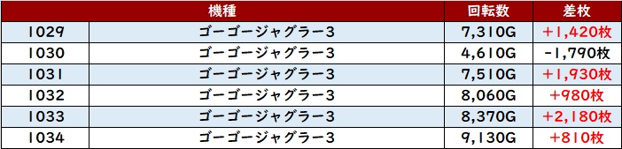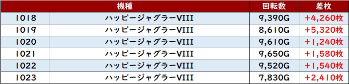 続いて「ハッピー3 1018~1023」が全台プラス差枚と安定感感じる素晴らしい功績を残す。
