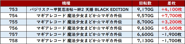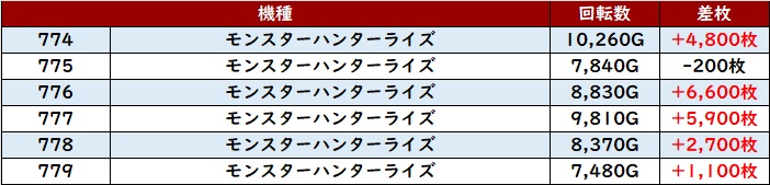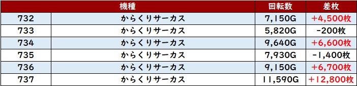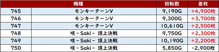回転数1万G超えが散見される程どの台もぶん回され、その結果6台中5台が差枚数+2,200枚以上の大きな出玉感を手にしていた。