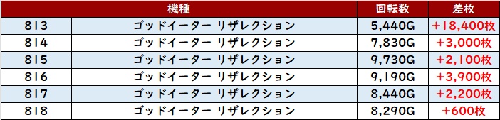 まずは「スマスロゴッドイーター 813~818」が全台プラス差枚と好調さを発揮!