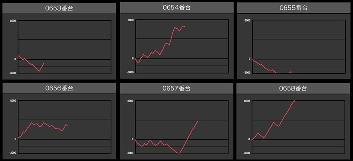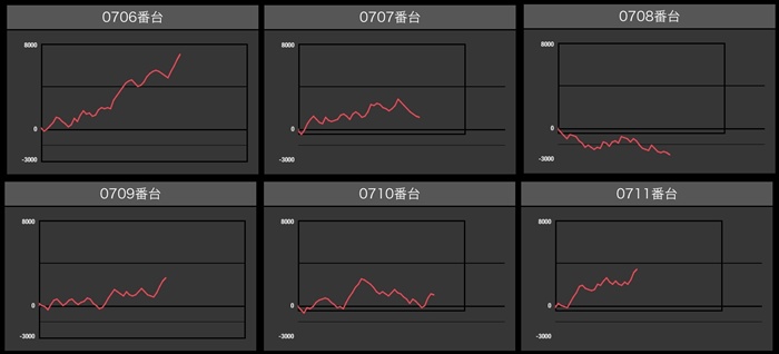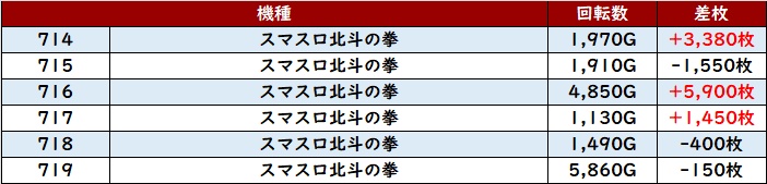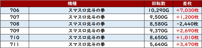 特に「スマスロ北斗 706~711」は殆どが回転数8,500G超えに加えて6台中5台が大幅プラス差枚と優秀な結果へ導いていた!