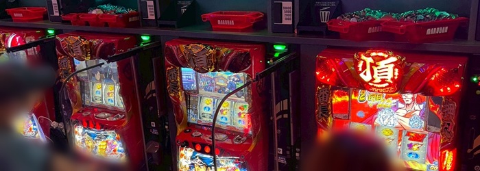 朝イチは「新鬼武者3」「東京リベンジャーズ」「東京喰種」「銭形5」「マギレコ」「モンキー5」が満台、メダル機も「マイジャグ5」「ウルミラ」「番長ZERO」などが埋まっていた。