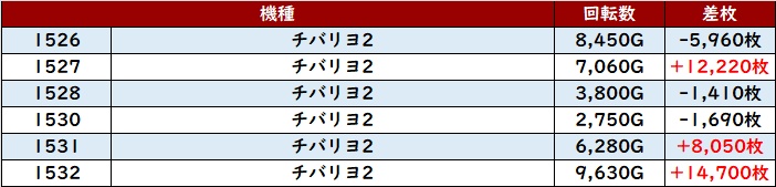 続いて「チバリヨ2 1526~1532」から強烈な出玉感を叩き出す台を目撃!