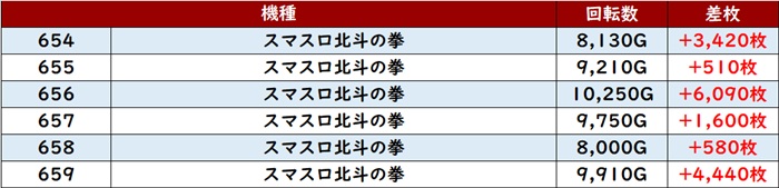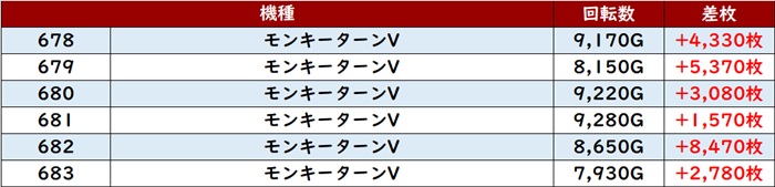 まずは「モンキー5 678~683」が全台回転数8,100G超えの高稼働を記録!