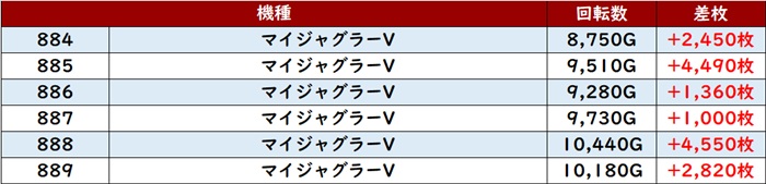 続いて「ジャグラーシリーズ」の活躍も目立っており、中でも「マイジャグ5 884~889」が全台大幅プラス差枚と終日大賑わい!