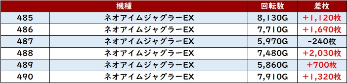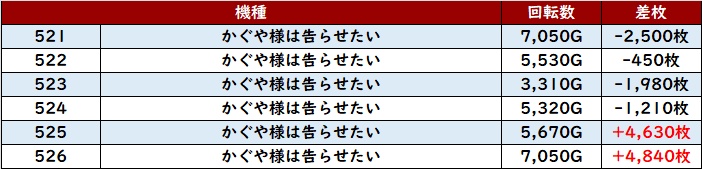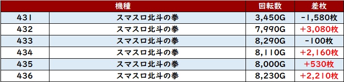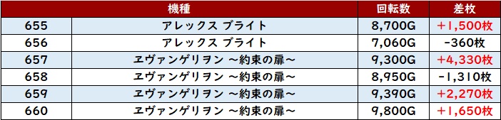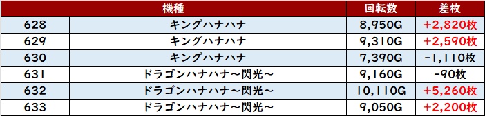 6台中4台が回転数8,900G超え且つ差枚数+2,200枚以上と大いに賑わっており、中には差枚数+5,260枚と驚愕の結果を残す台まで現れた。