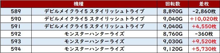 まずは「DMC5ST~モンハンライズ 589~594」が全台回転数8,700G超えと文句なしの稼働状況に!