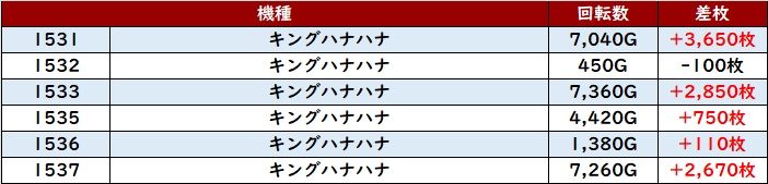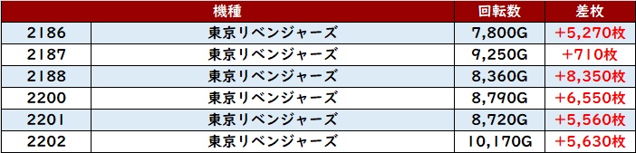 まずは「東京リベンジャーズ 2186~2202」の殆どが差枚数+5,200枚超えの輝かしい出玉感に!