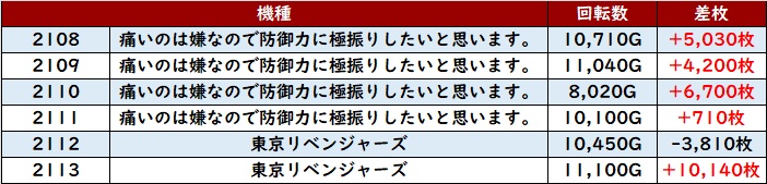 まずは「防振り~東京リベンジャーズ 2108~2113」の6台中5台が回転数1万G超えを達成!