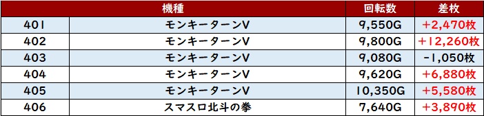 まずは「モンキー5~スマスロ北斗 401~406」が機種跨ぎで大盛況に!