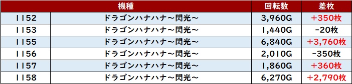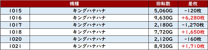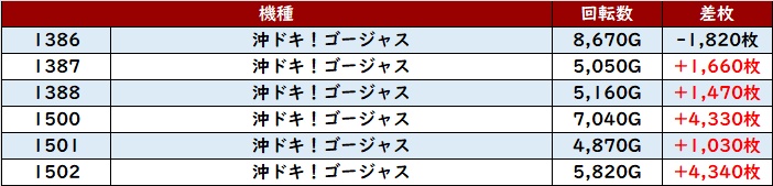 まずは「沖ドキゴージャス 1386~1502」が6台中5台が大幅プラス差枚と絶好調!