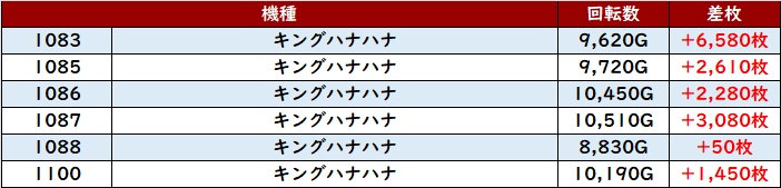 更に「キンハナ 1083~1100」が全台回転数8,800G超え且つプラス差枚と大盛況に!