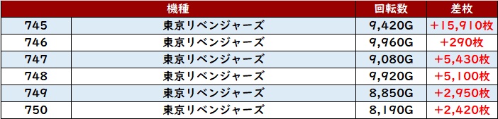 まずは「東京リベンジャーズ 745~750」が全台プラス差枚と結果を残す!