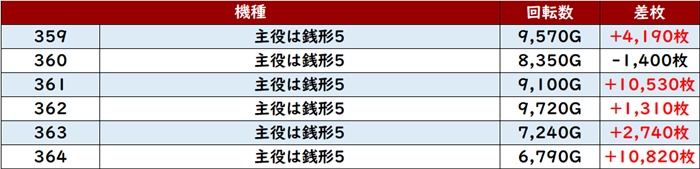 まずは「銭形5 359~364」が驚愕の光景に!