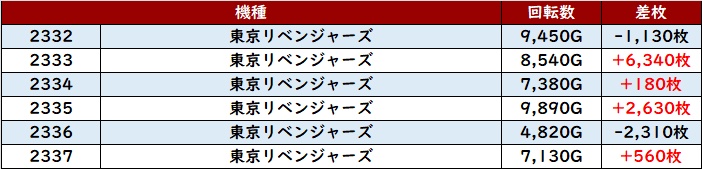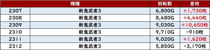 半数以上が大幅プラス差枚に加え、殆どが回転数8,700G越えと腰を据えて粘るユーザーが多数見られ、スマスロに引けを取らない勢いを見せた。