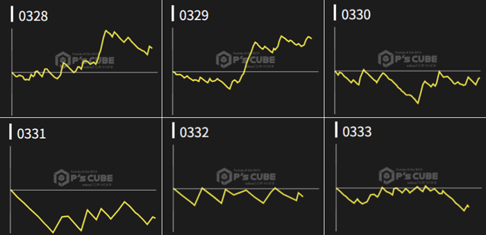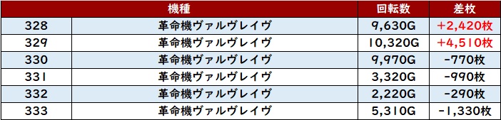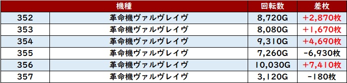 まずは「ヴヴヴ 328~333、352~357」が2箇所にわたって回転数8,000G超えの高稼働となる台が続出!