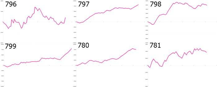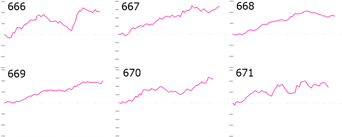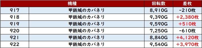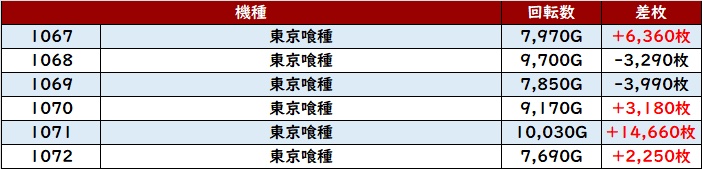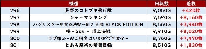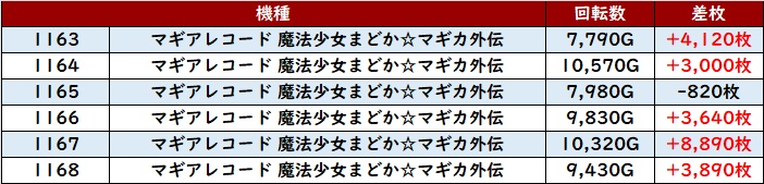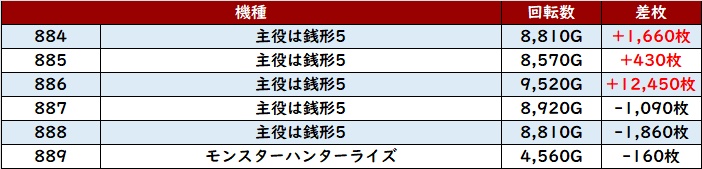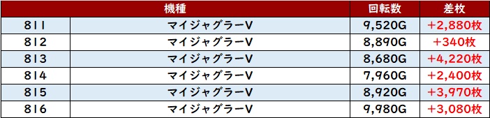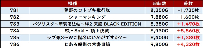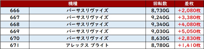 その稼働がポテンシャルを引き出し、6台中5台が差枚数+3,000枚以上の大幅プラス差枚を獲得していた。