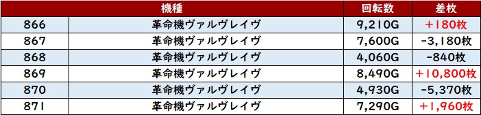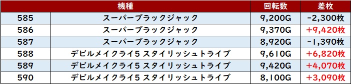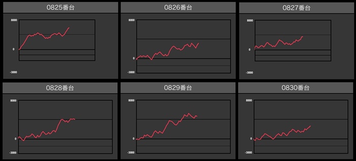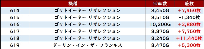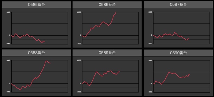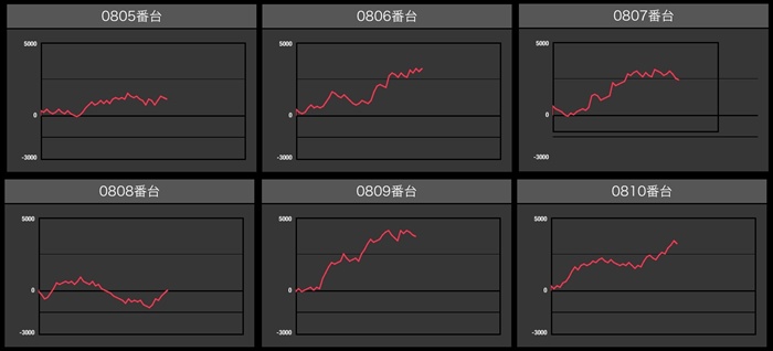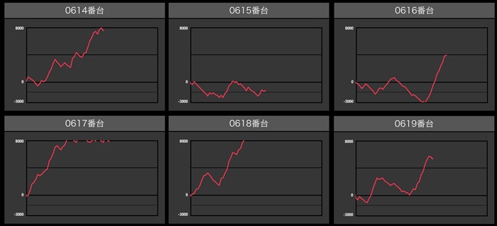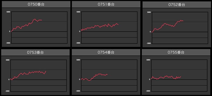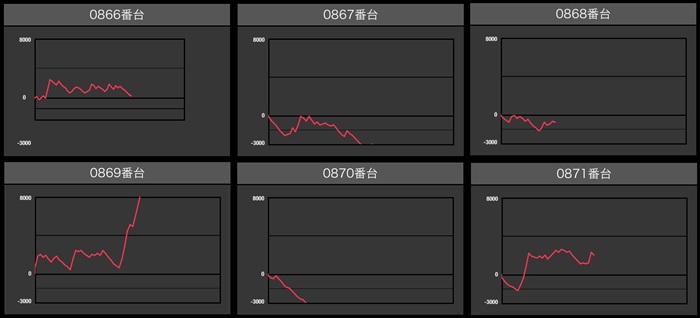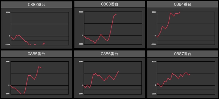 6台中5台が差枚数+3,300枚超えの大幅プラス差枚、中には差枚数+10,330枚と頭一つ抜けた出玉感も見られ、好調さを周囲に見せつけていた。