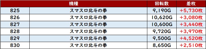 まずは「スマスロ北斗 825~830全台大幅プラス差枚と素晴らしい結果に!