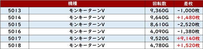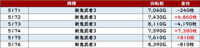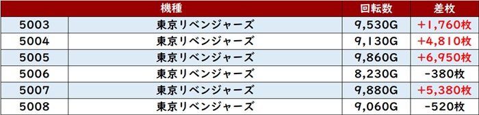 差枚数+1万枚超えを筆頭に差枚数+3,300枚超えを記録する台が大半を占め、朝から人気を博した理由が詰まった出玉感であった!