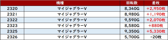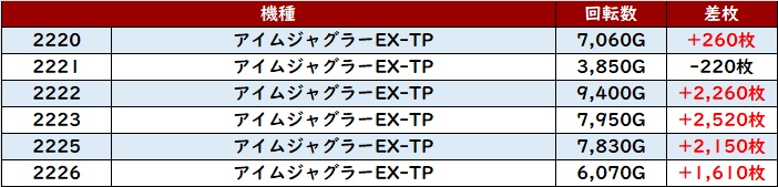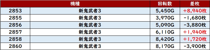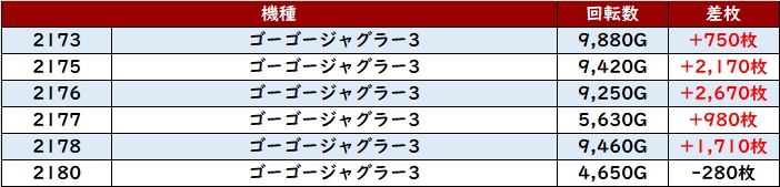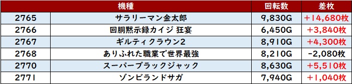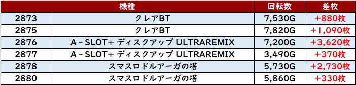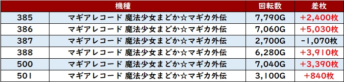 その稼働の高さと優れた状況が相まり、驚異の差枚数+6,080枚を筆頭に大半が差枚数+2,700枚超えという非の打ち所がない出玉感に結びついた。