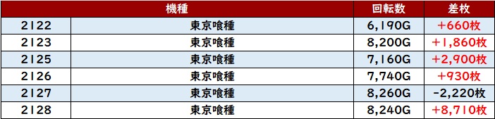 朝イチは「東京リベンジャーズ」「東京喰種」「銭形5」「マイジャグ5」「モンキー5」の順に満台となった。