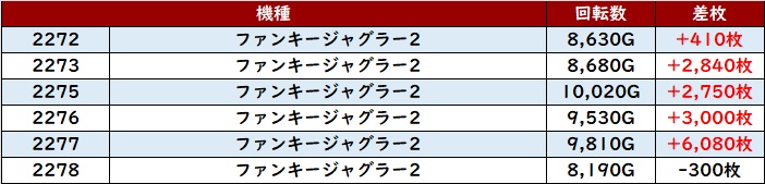 更に「ファンキー2 2272~2278」全台回転数8,100G超えと、確信を得たような稼働率に!