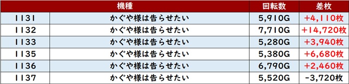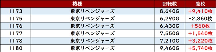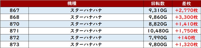 まずは「スタハナ 867~873」が全台プラス差枚と素晴らしい結果に!