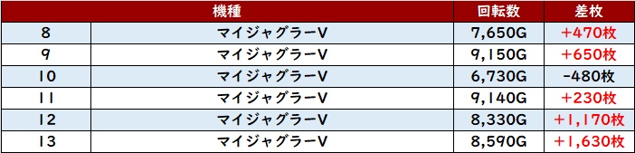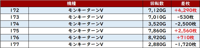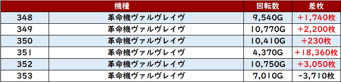 まずは「ヴヴヴ 348~353」6台中5台がプラス差枚と絶好調!