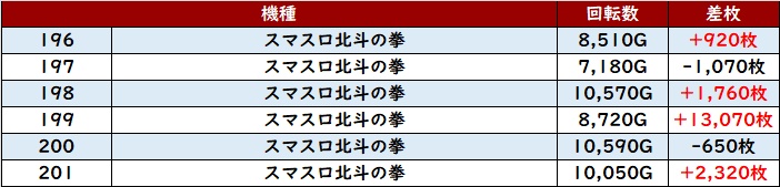 続いて「スマスロ北斗 196~201」からも差枚数+13,070枚と衝撃の出玉感を目撃!