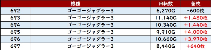 ・スロット集計機種計42台総差枚数:+69,000枚