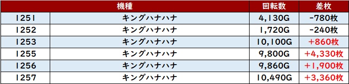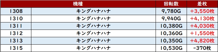 まずは「キンハナ 1251~1257、1308~1315」のどちらにも回転数1万G超えが続出!