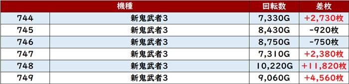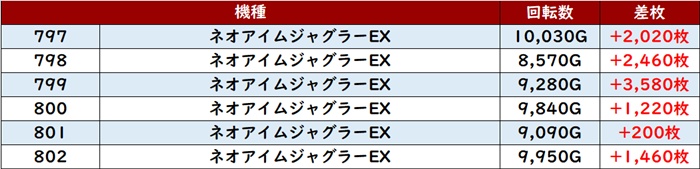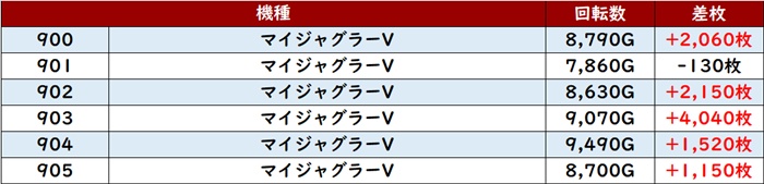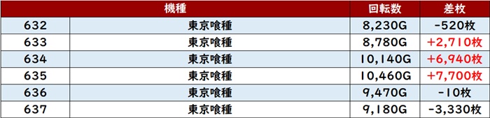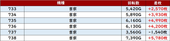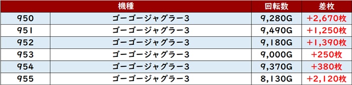 更に6台中5台が回転数9,300G超えと終日ぶん回されており、この出玉感が必然の結果であったことは誰が見ても明らかだった!