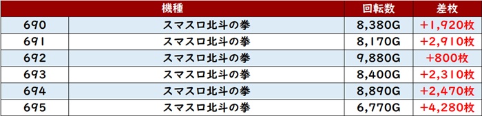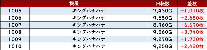 中でも「キンハナ 1005~1010」全台大幅プラス差枚を記録したうえ、差枚数+6,690枚と強烈な印象を残す台まで現れ、存在感が際立っていた。