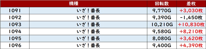 まずは「いざ番 1091~1096」差枚数+10,830枚を筆頭に、殆どが差枚数+3,000枚超えと輝かしい出玉感に!
