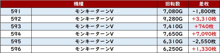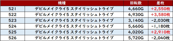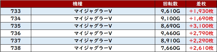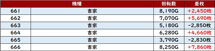 差枚数+7,860枚を筆頭に6台中4台が差枚数+2,400枚超えを獲得しており、ユーザーの満足度も高かったことだろう。