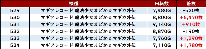 続いて「マギレコ 535~540」が全台回転数8,500G超えに!