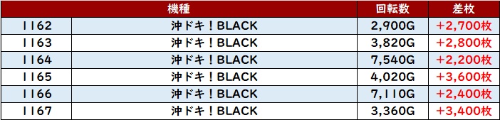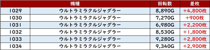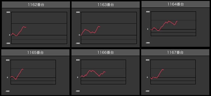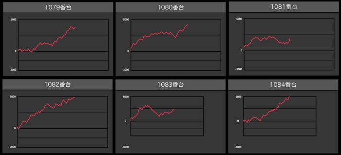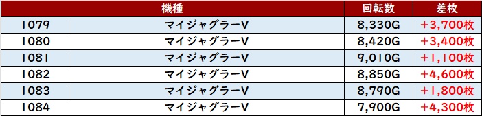 まずは「マイジャグ5 1079~1084」が全台大幅プラス差枚を記録!