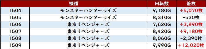 まずは「モンハンライズ~東京リベンジャーズ 1504~1509」の殆どが回転数8,000G超えの高稼働に!
