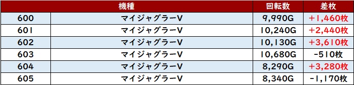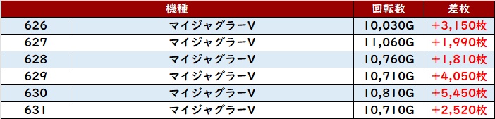 まずは「マイジャグ5 626~631」が差枚数+5,450枚を筆頭に全台大幅プラス差枚に!