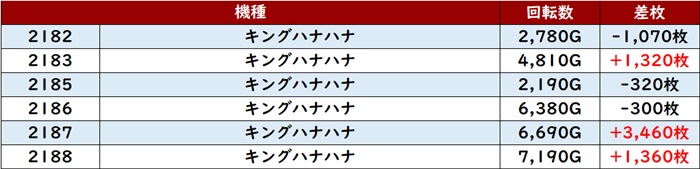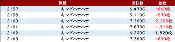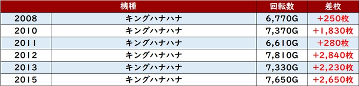 いずれの箇所も抜群の稼働状況となり、特に「キンハナ 2008~2015」が全台プラス差枚と爪痕を残した。