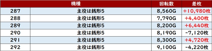 まずは「銭形5 287~292」が新台らしい盛り上がりに!