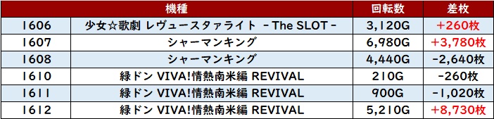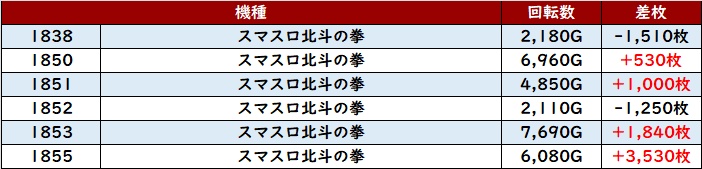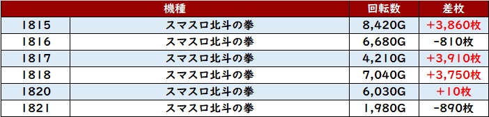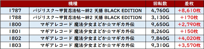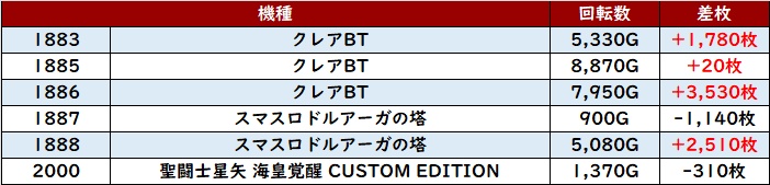 回転数8,400G超えや差枚数+8,800枚以上という数値が半数から見られ、朝人気を博していたことも納得の状況であった。