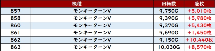 まずは「モンキー5 857~863」が全台回転数9,100G超え且つ全台大幅プラス差枚に!